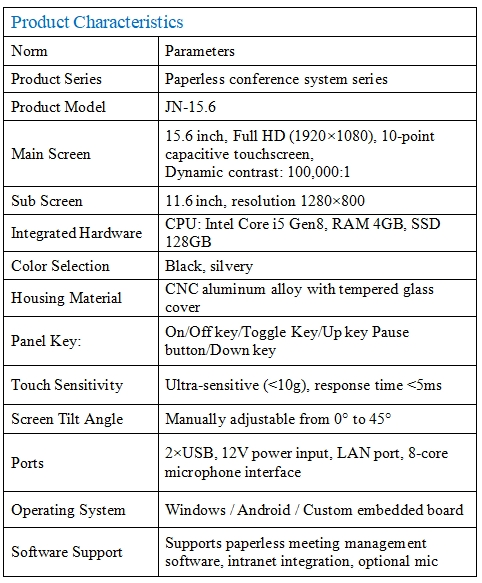 Este terminal de desktop, com uma tela sensível ao toque principal de 15,6 polegadas e uma tela traseira de 11,6 polegadas, faz parte de um sistema de conferência abrangente sem papel, projetado para aprimorar a eficiência, a segurança e a interação da reunião