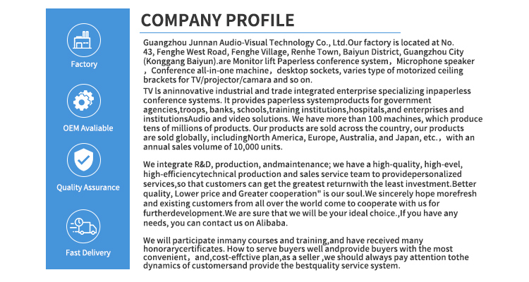 Os monitores levantadores de monitor LCD com tela OLED elétrica avançada são adequados para todos os tipos de cenas, temos tecnologia de corte de máquina CNC e tecnologia a laser, a mais nova tecnologia de levantador de tela LCD de mesa de conferência para garantir que o produto tenha padrões ultra-altos. Todos os nossos elevadores LCD de tela OLED pertencem ao Made in China, disponíveis para compra no atacado, podem ser personalizados de forma privada para os clientes e têm elevadores elétricos de monitor LCD com tela de toque suficiente em estoque para suporte à entrega rápida aos clientes. E nosso equipamento junnan possui uma variedade de certificados como CCC, certificado CE, ROHS, certificação ISO, o produto é seguro e de alta qualidade, com qualificação para exportação, é uma fábrica direta com preço favorável, possui fábrica própria e está operando há muitos anos.